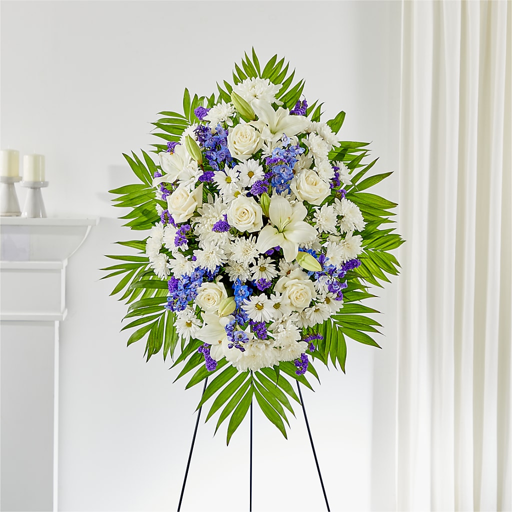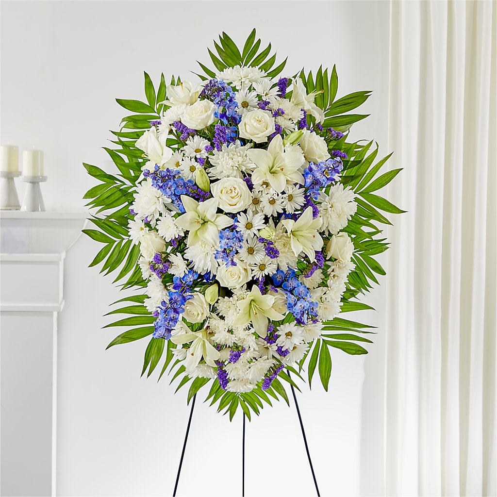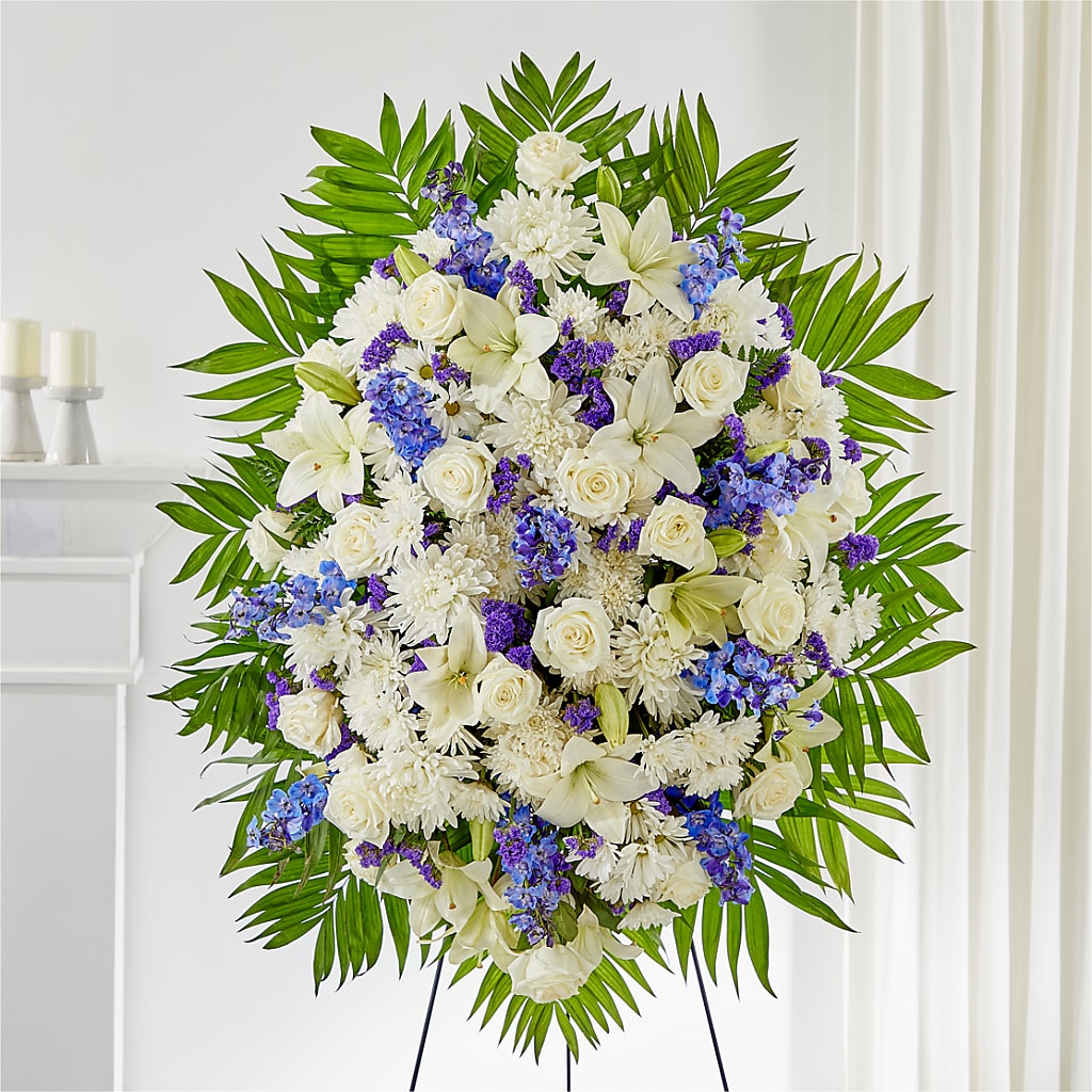Rendez hommage avec un hommage permanent de fleurs blanches et bleues, soigneusement stylisées pour exprimer les mots qui peuvent être difficiles à trouver.