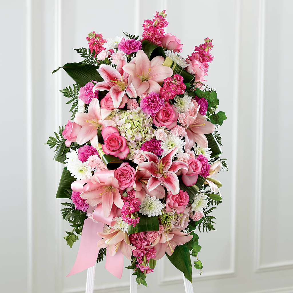 Notre bouquet réconfortant sur pied combine des fleurs rougissantes dans un design classique sur pied pour accentuer élégamment vos messages de chagrin sincère. Conçu par nos talentueux designers, ce grand hommage est un magnifique assortiment d'hortensias, de lys, de giroflées, de roses et plus encore. Il constitue une superbe présentation lors de tout service commémoratif pour le décès d'un être cher.